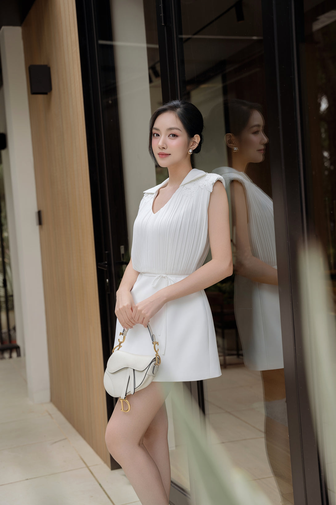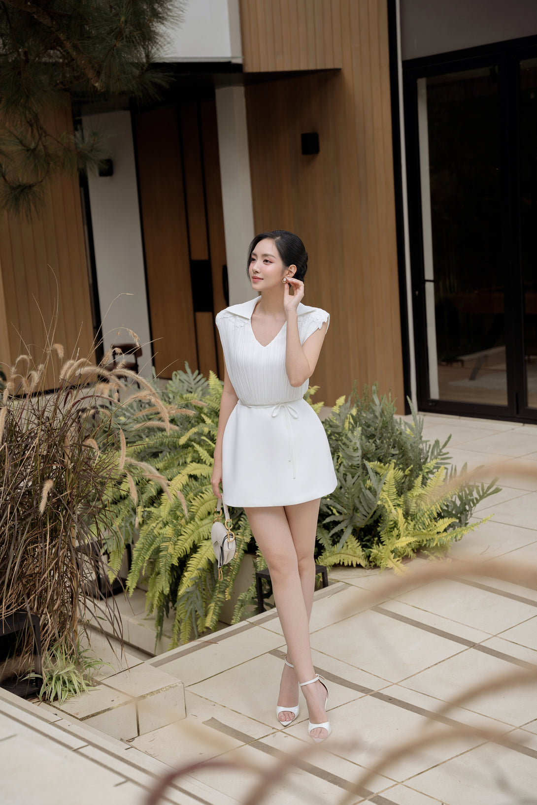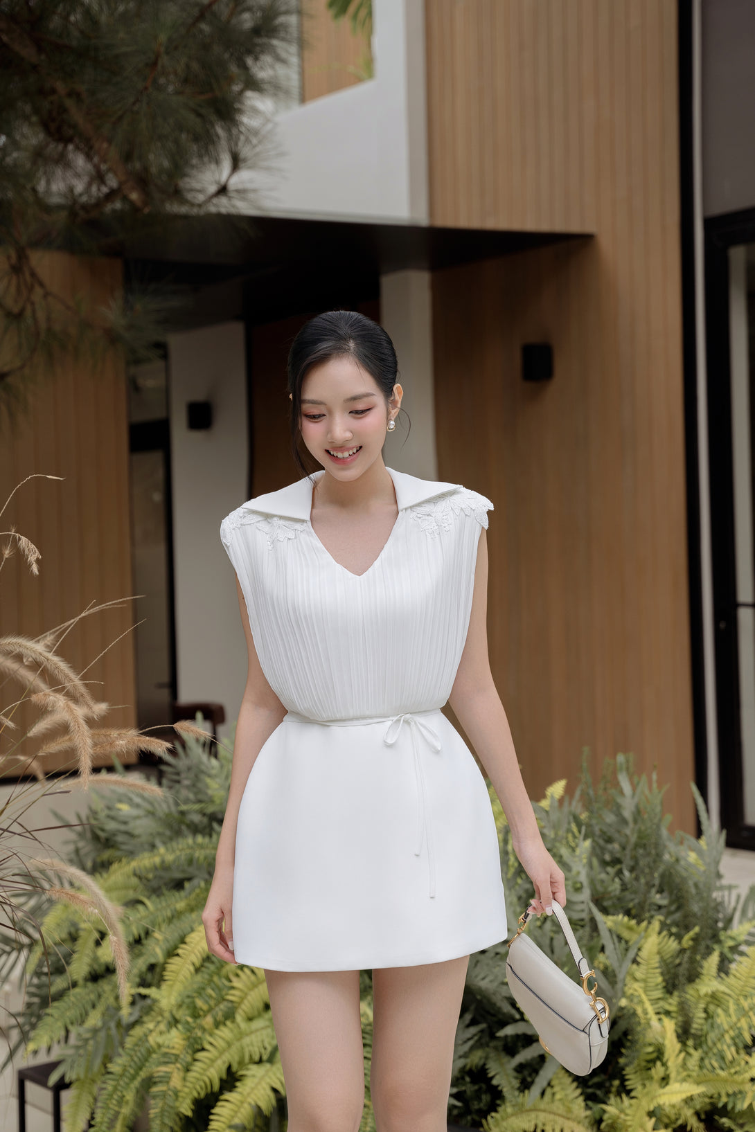 Fresh and refined, this short white A-line dress captures the essence of youthful elegance. The clean, structured silhouette flatters the figure, while the crisp white tone exudes purity and sophistication. At the bodice, delicate floral appliqué detailing adds a touch of artistry and romance, elevating the design with subtle charm.
