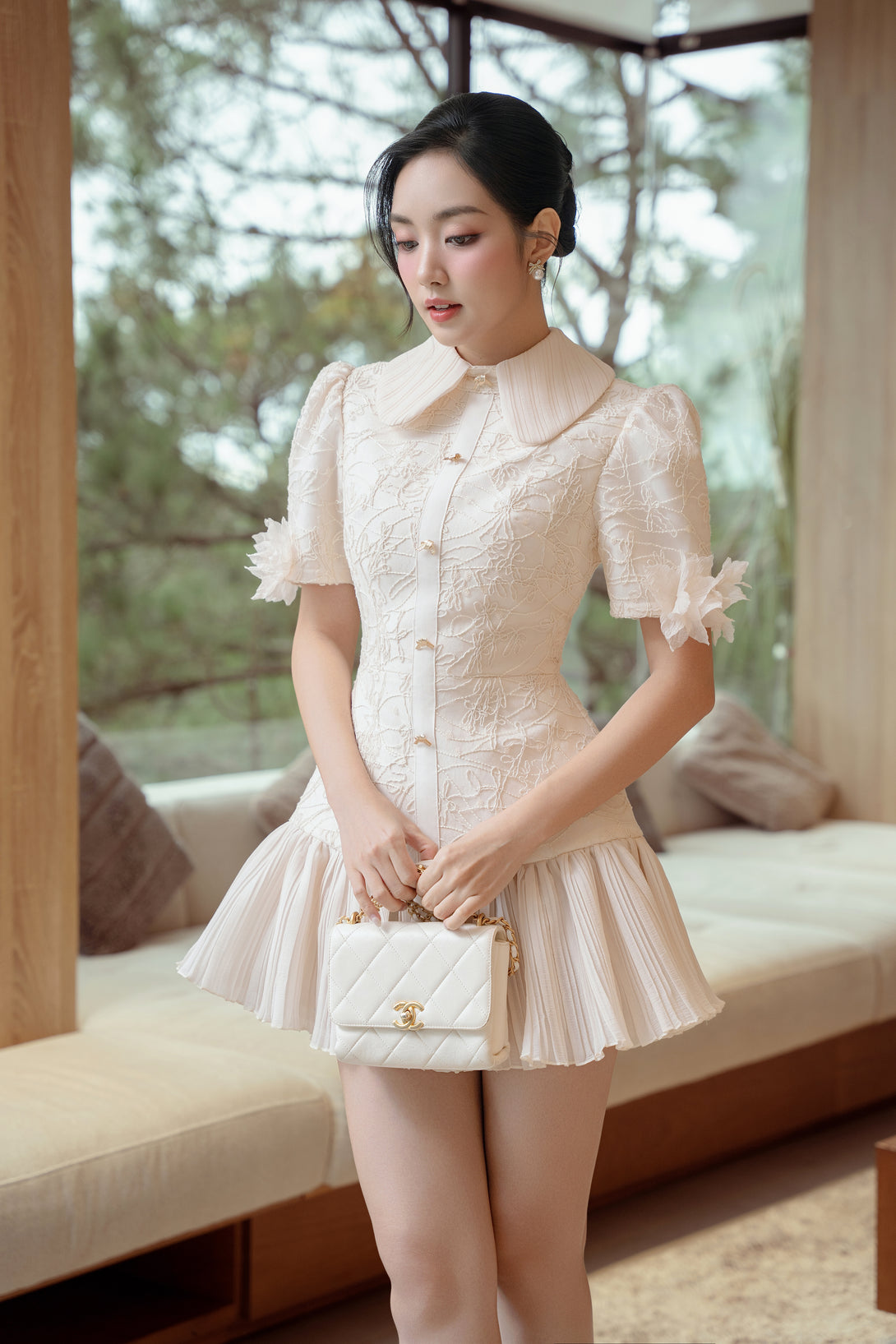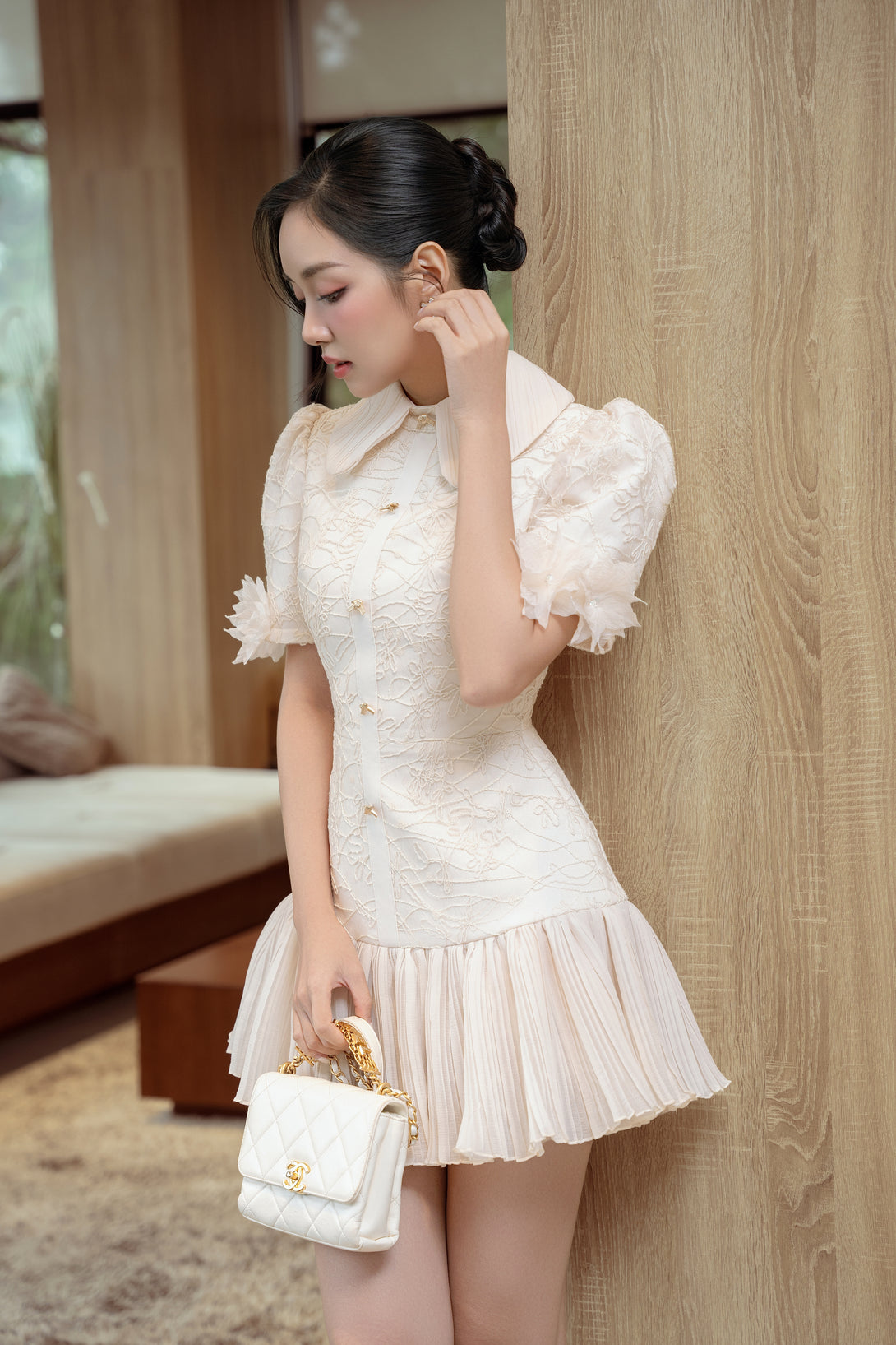 The highlight lies in its puffed sleeves with a classic touch, delicately trimmed with 3D floral accents at the edges, paired with a wide pleated collar that adds a refined and graceful charm. A row of petite buttons running down the front serves as both a subtle decoration and a detail that elongates the look.