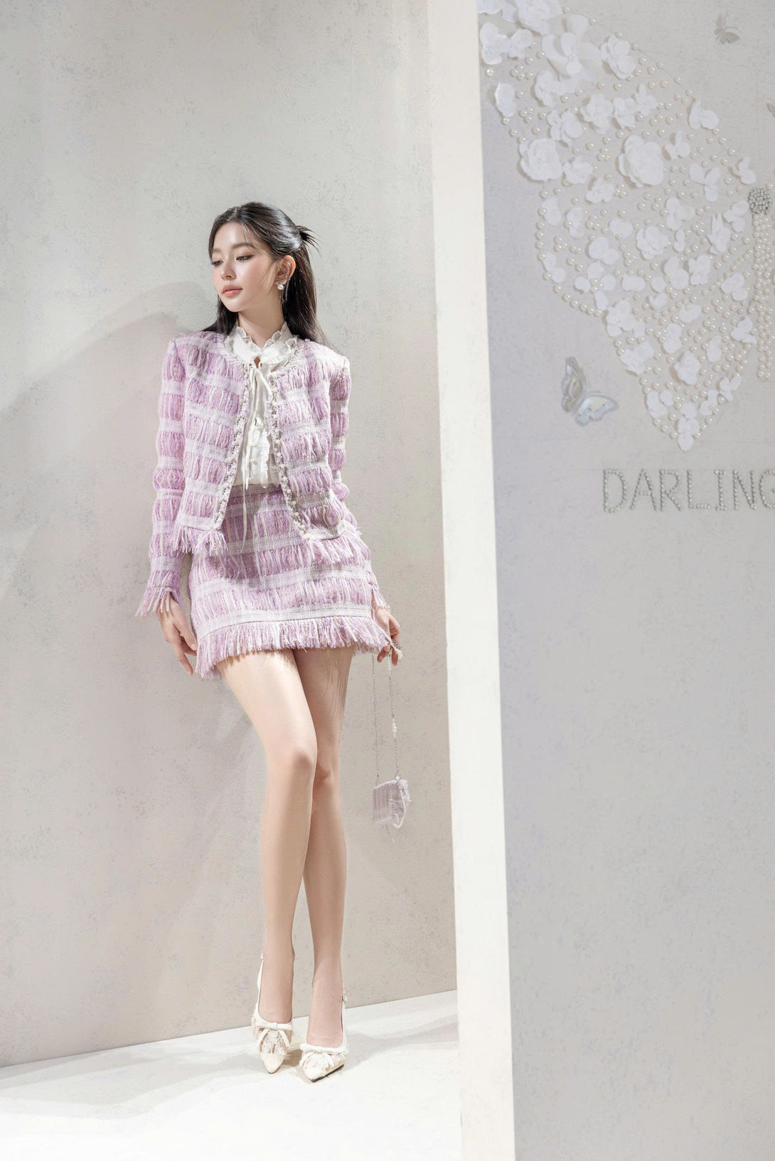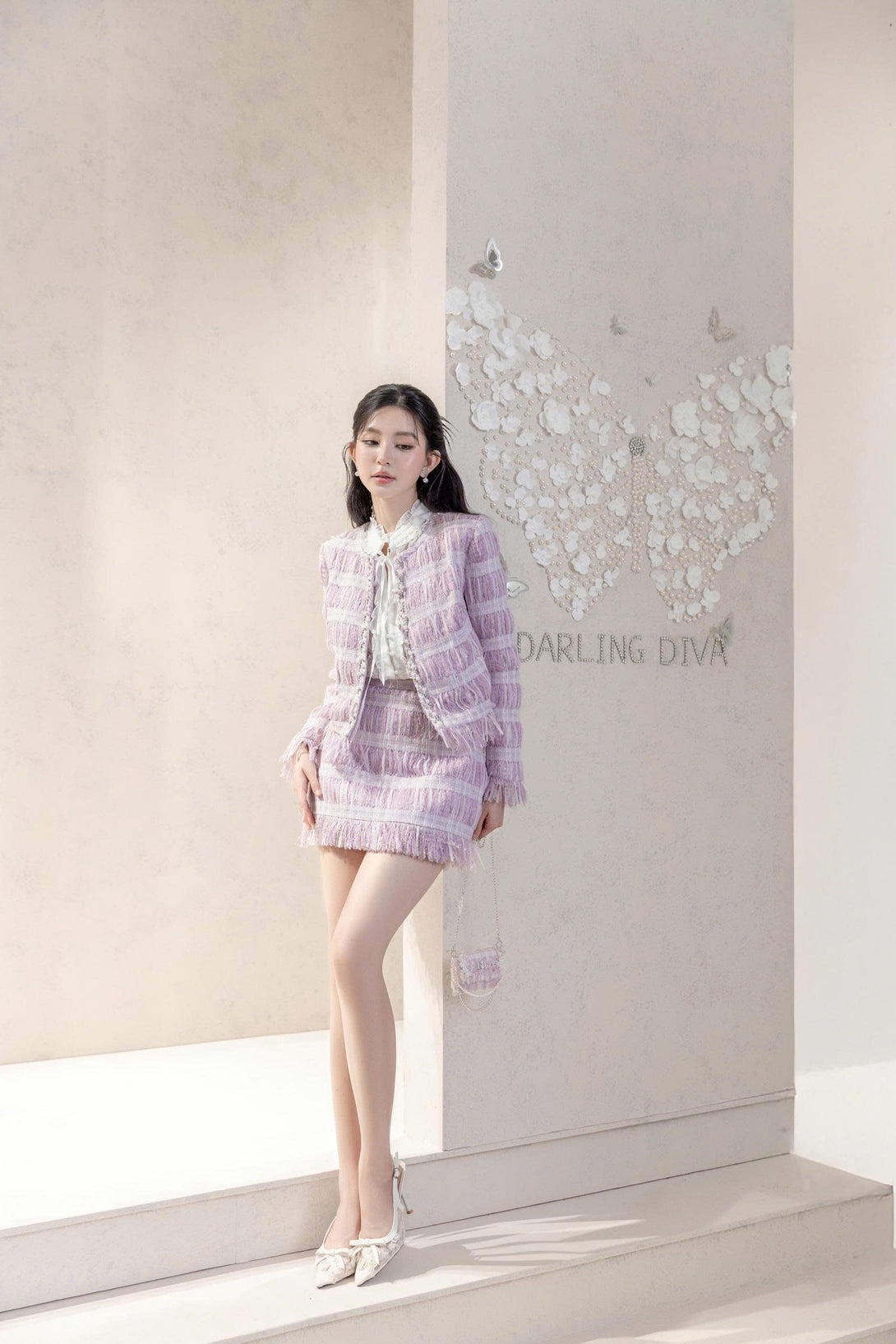 The pastel lilac tweed set is beautifully accented with a delicate organza bow at the collar, blending sweetness with sophistication. Its soft fabric and gentle lavender hue evoke the essence of a modern Barbie which is elegant, charming, and effortlessly chic.