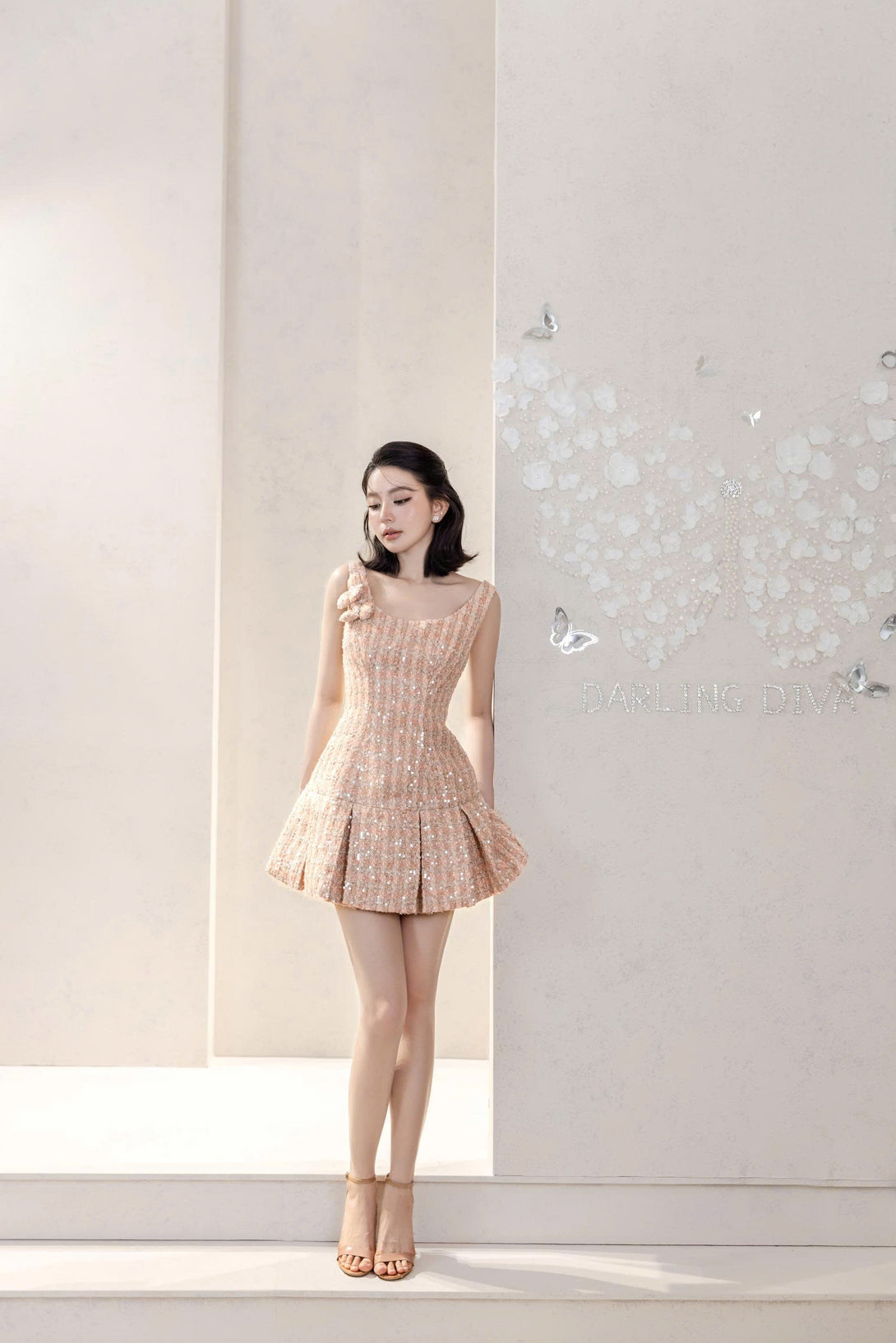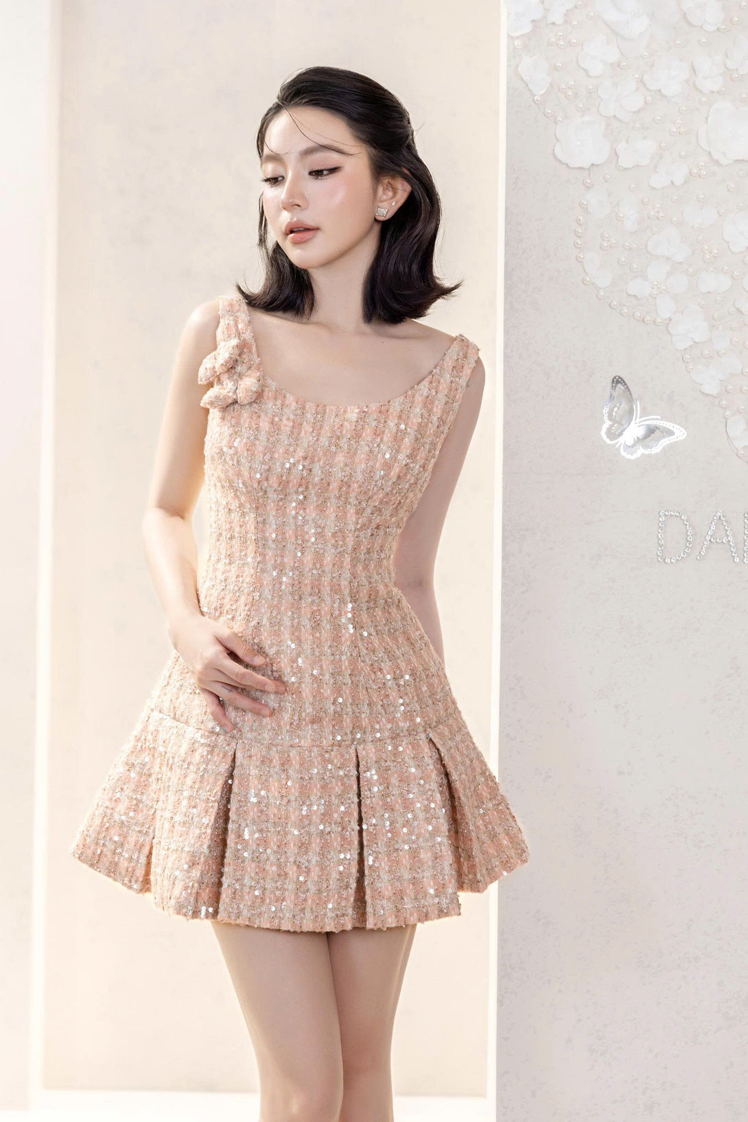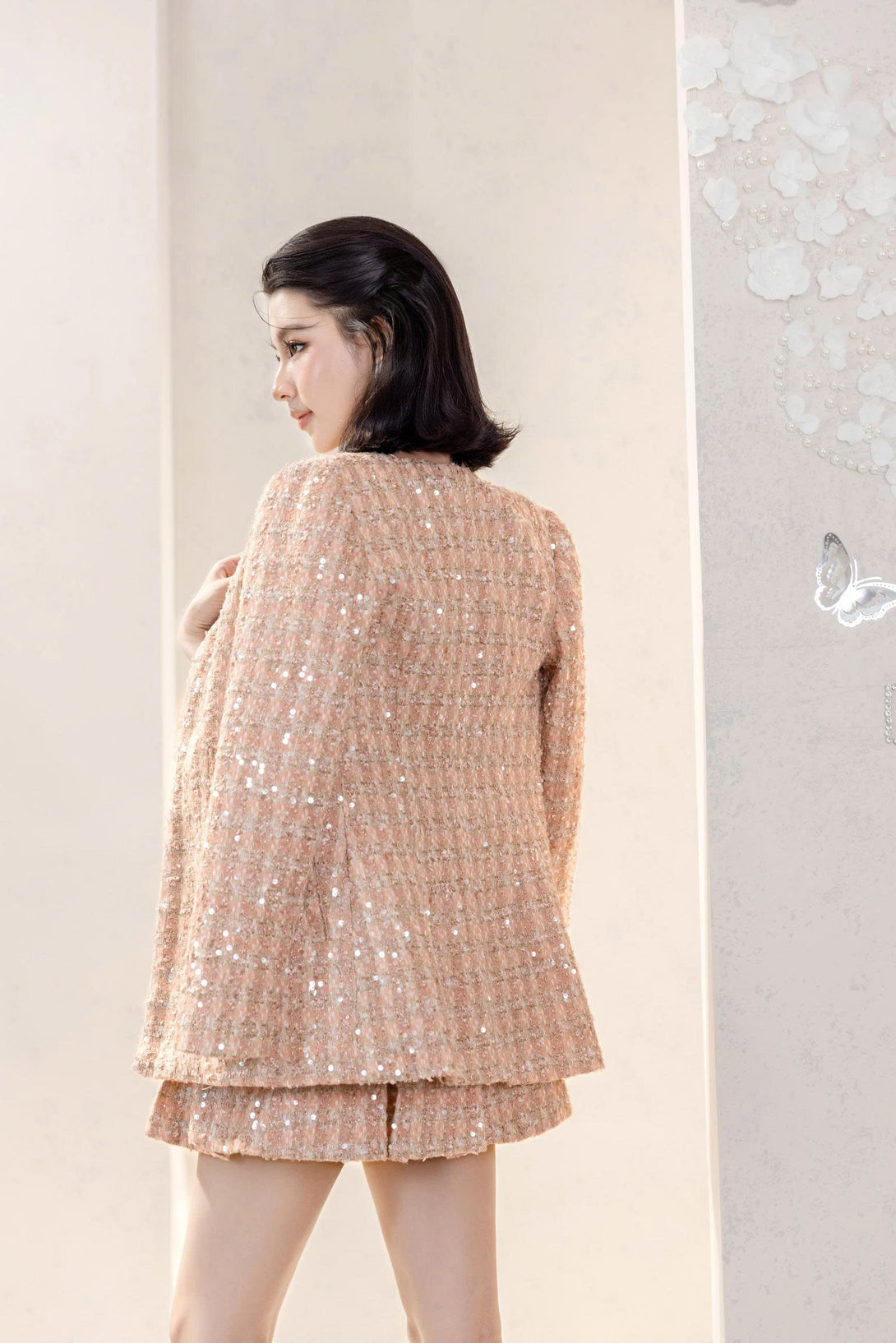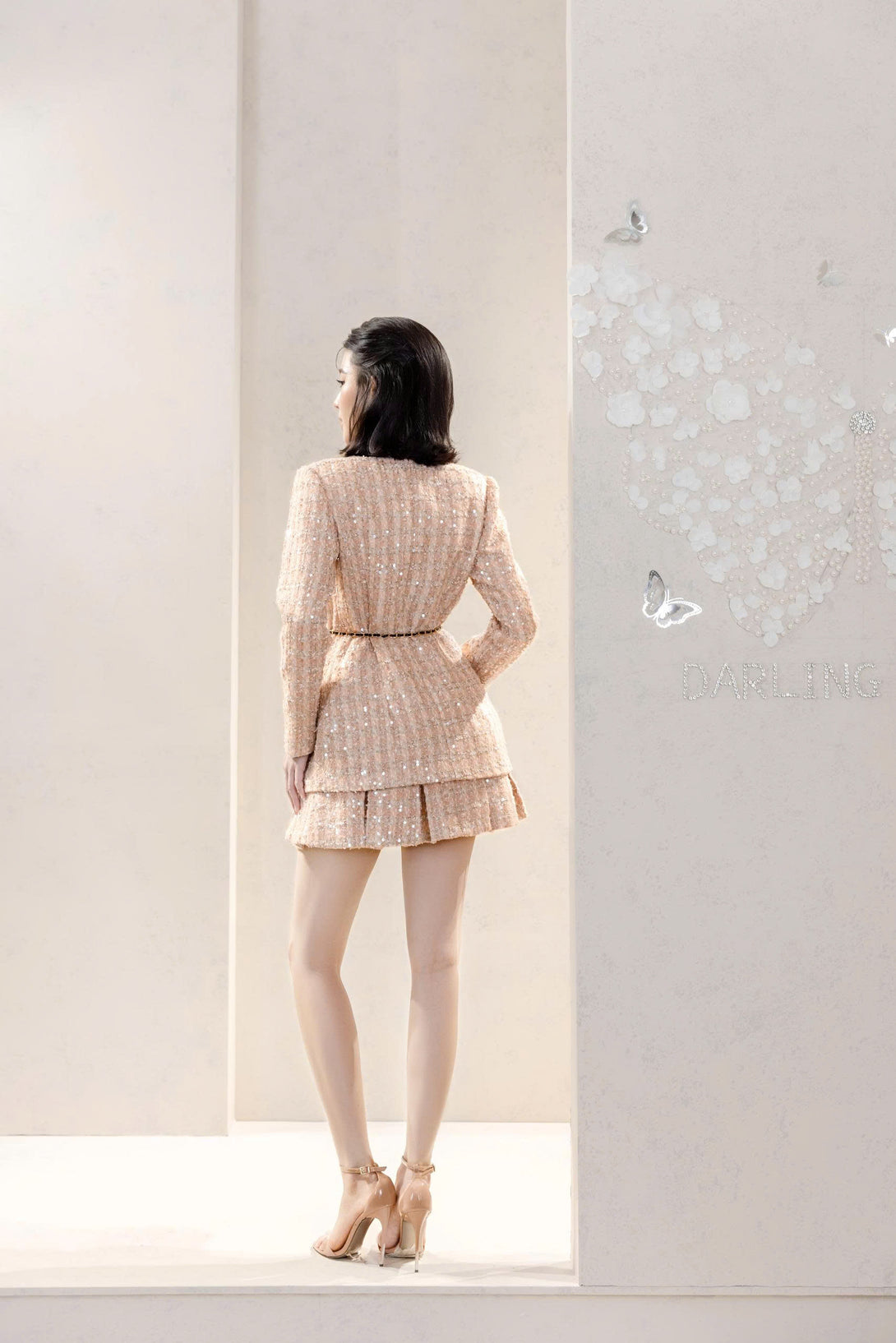 The shimmering rose-ginseng tweed set exudes soft luxury and timeless elegance.