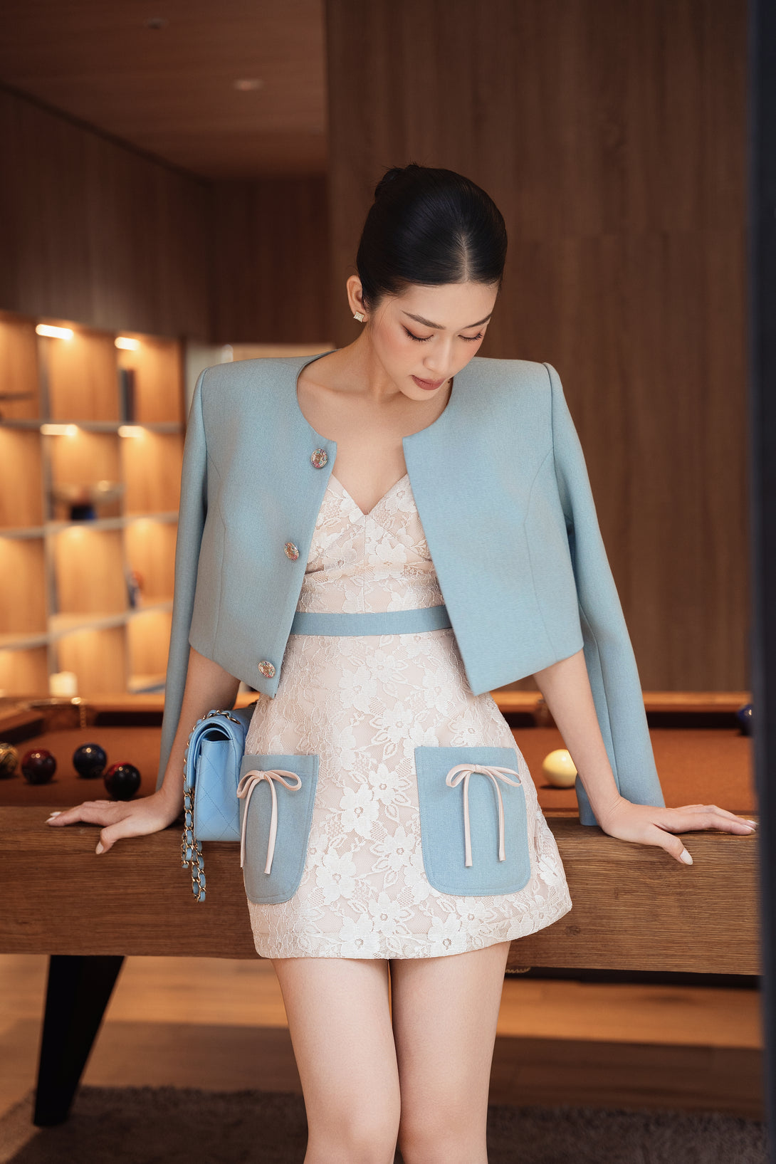omplementing it is a tailored blazer in a contemporary blue shade, lending a polished yet fashion-forward edge to the look.