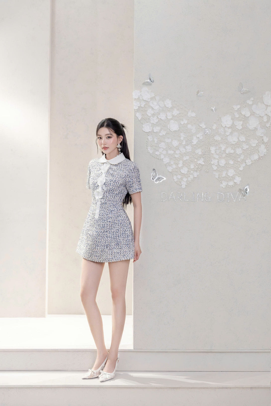The pastel blue tweed dress with a crisp white collar and intricate floral appliqués embodies a perfect harmony of classic charm and modern elegance. Its mini silhouette flatters the figure, while the soft blue hue evokes freshness and grace.