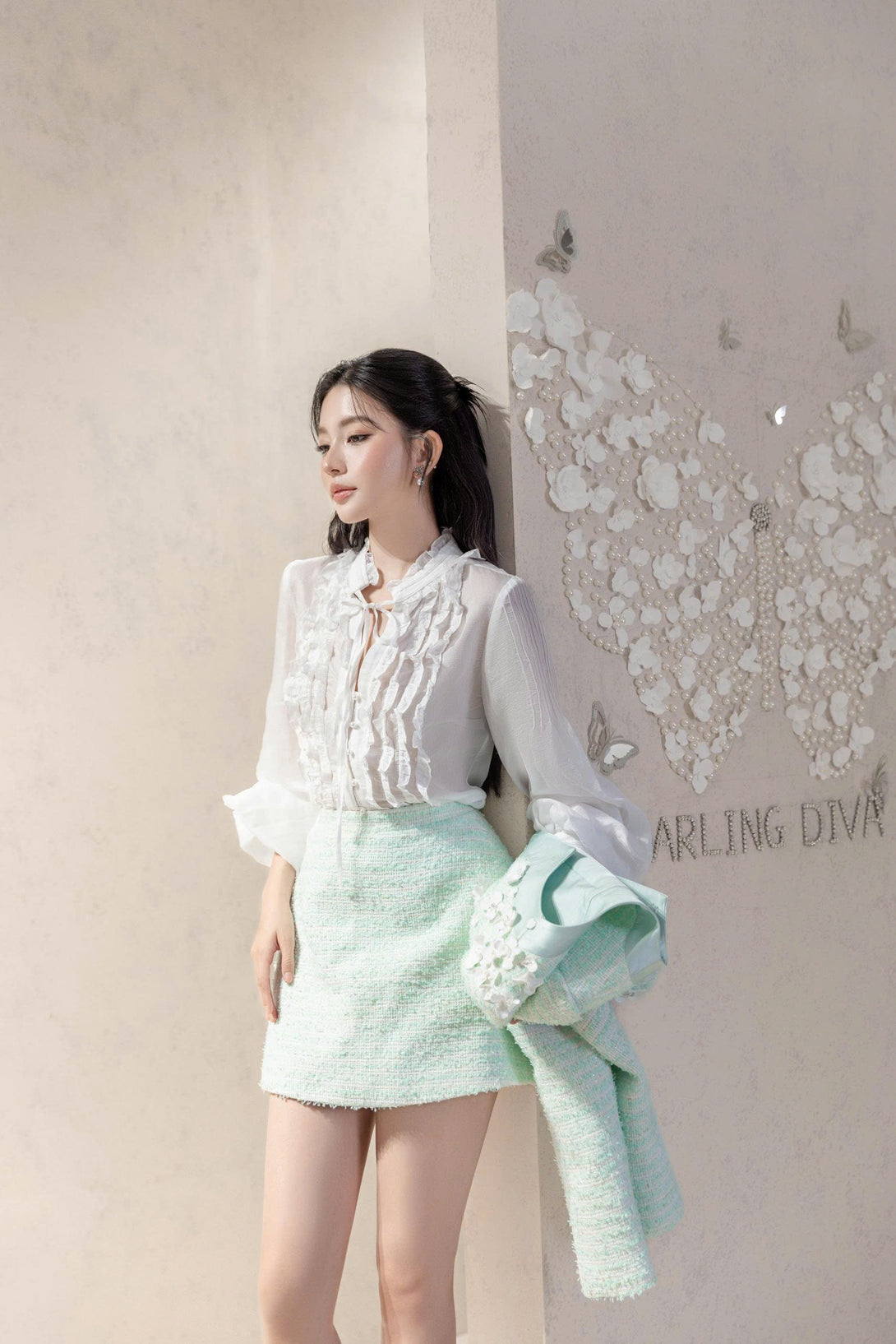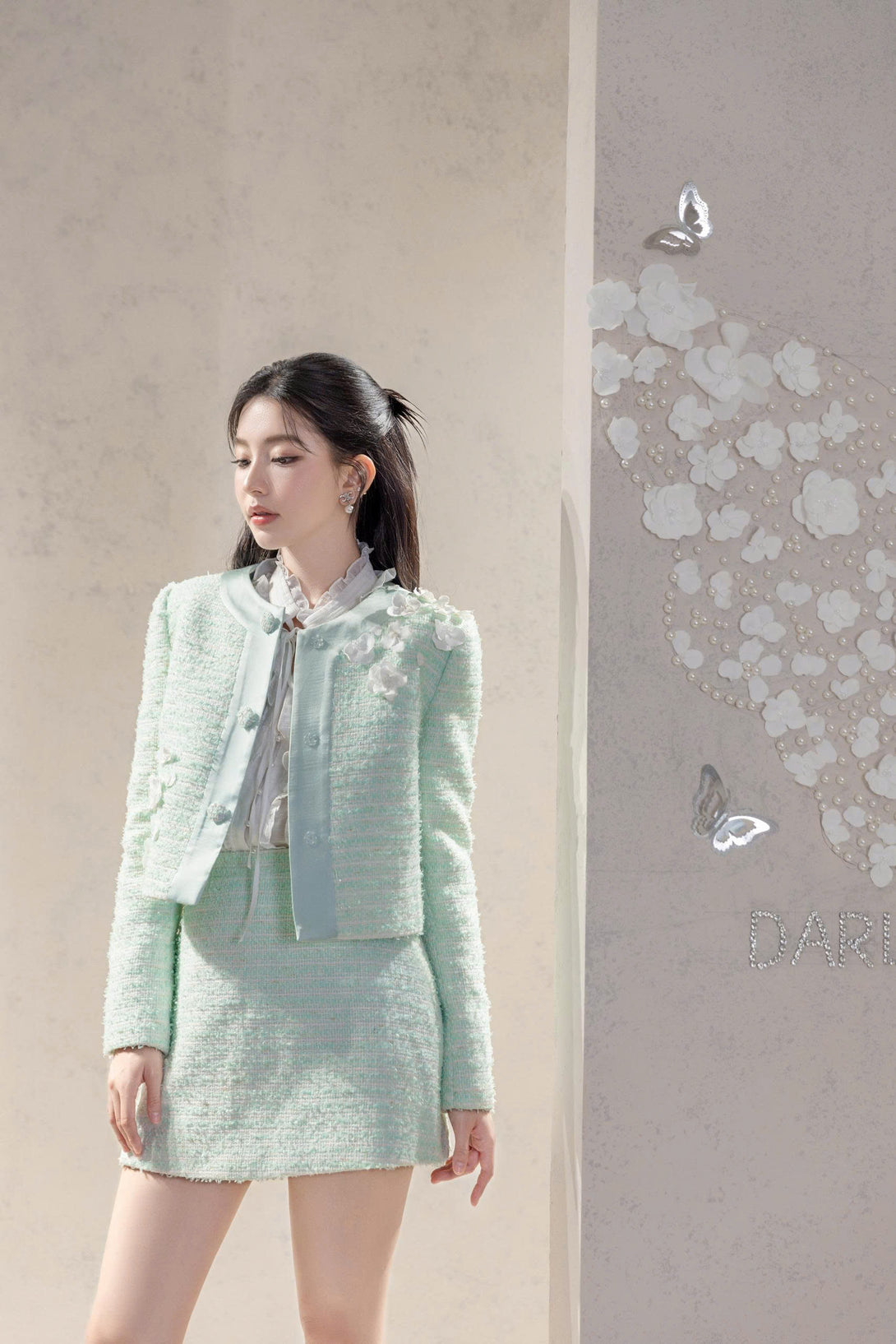 This mint tweed set pairs with a ruffled blouse for a touch of timeless grace. Each detail is crafted with precision, bringing together softness and structure in a balanced silhouette — perfect for elegant gatherings and refined occasions.