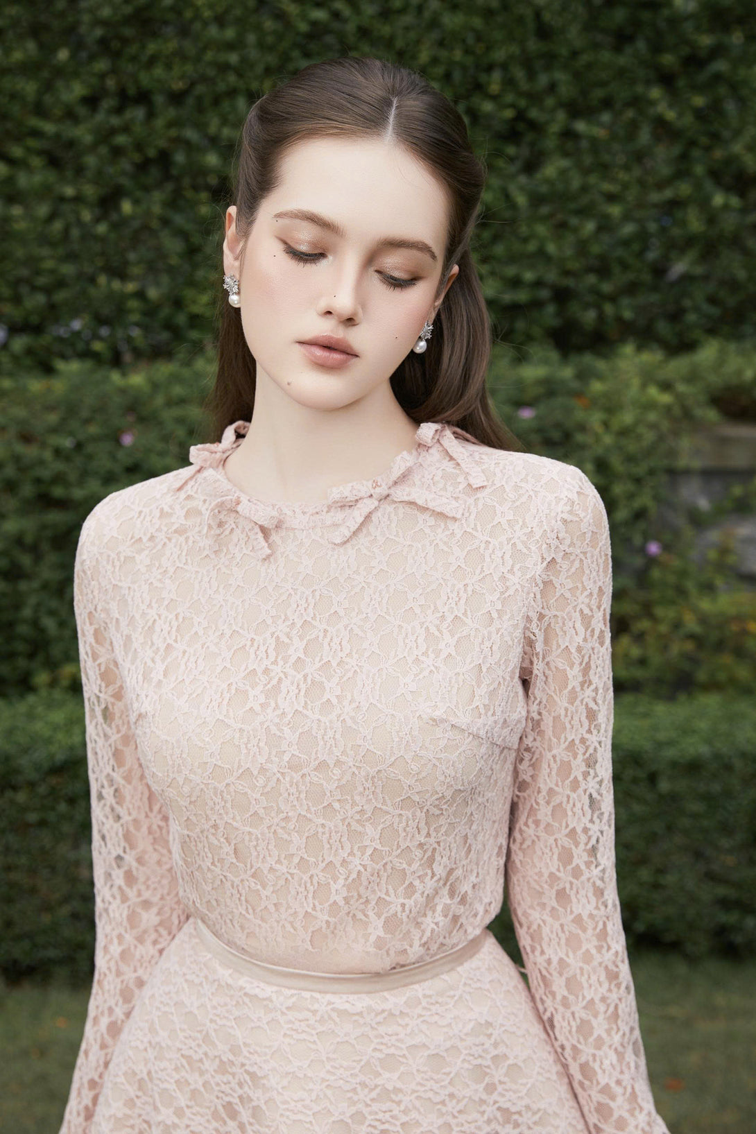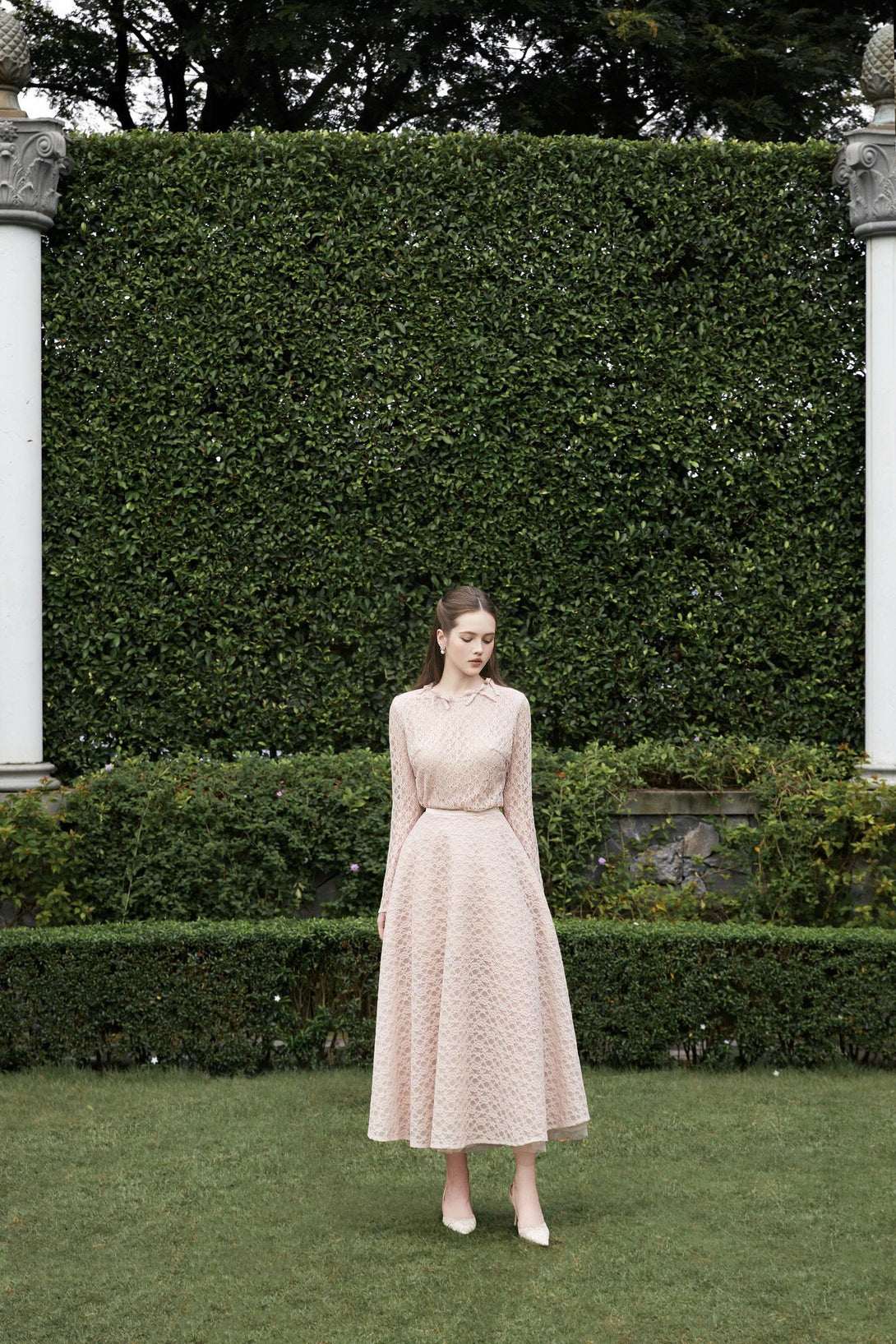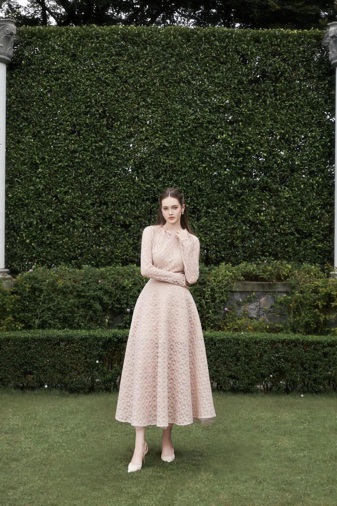Graceful and understated, this blush pink lace midi dress captures timeless femininity with a modern sensibility.