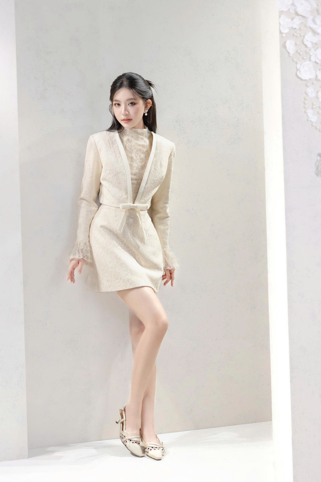 A white lace dress featuring a high neckline, sheer long sleeves, and a dainty back bow — the epitome of classic allure.