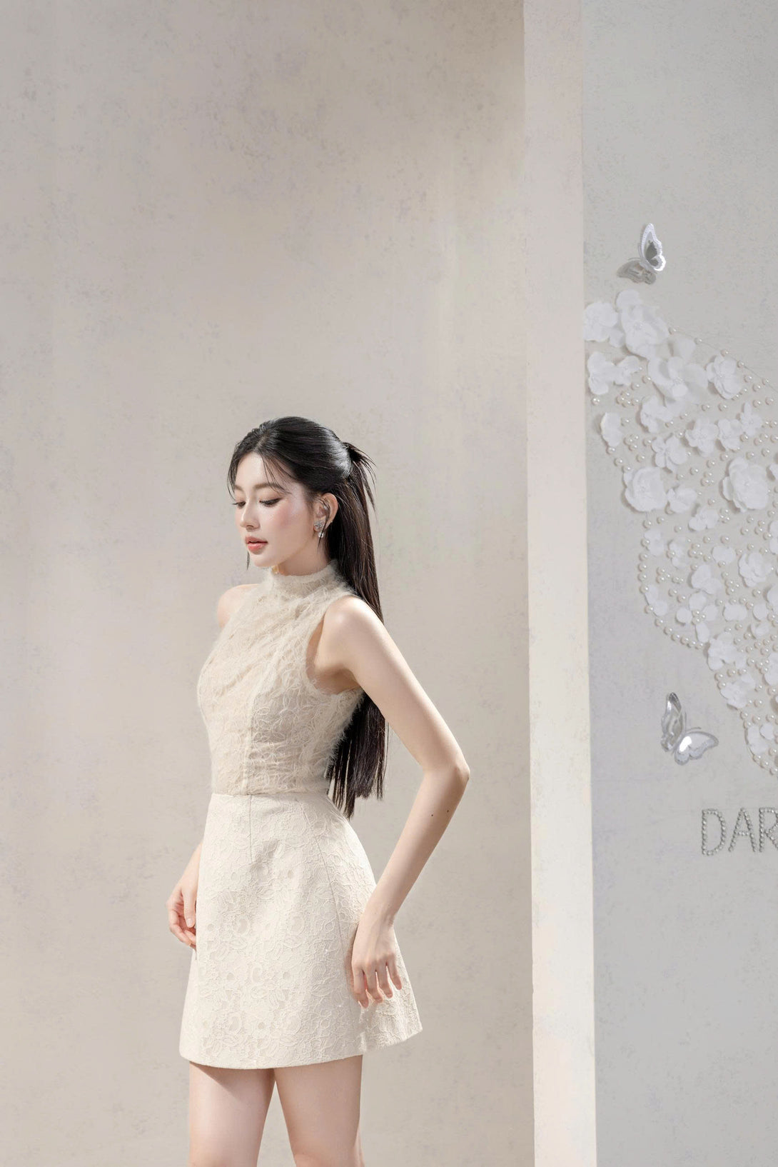 The intricate lacework and soft silhouette blend vintage charm with modern poise, capturing the essence of a graceful muse lost in her own reverie.