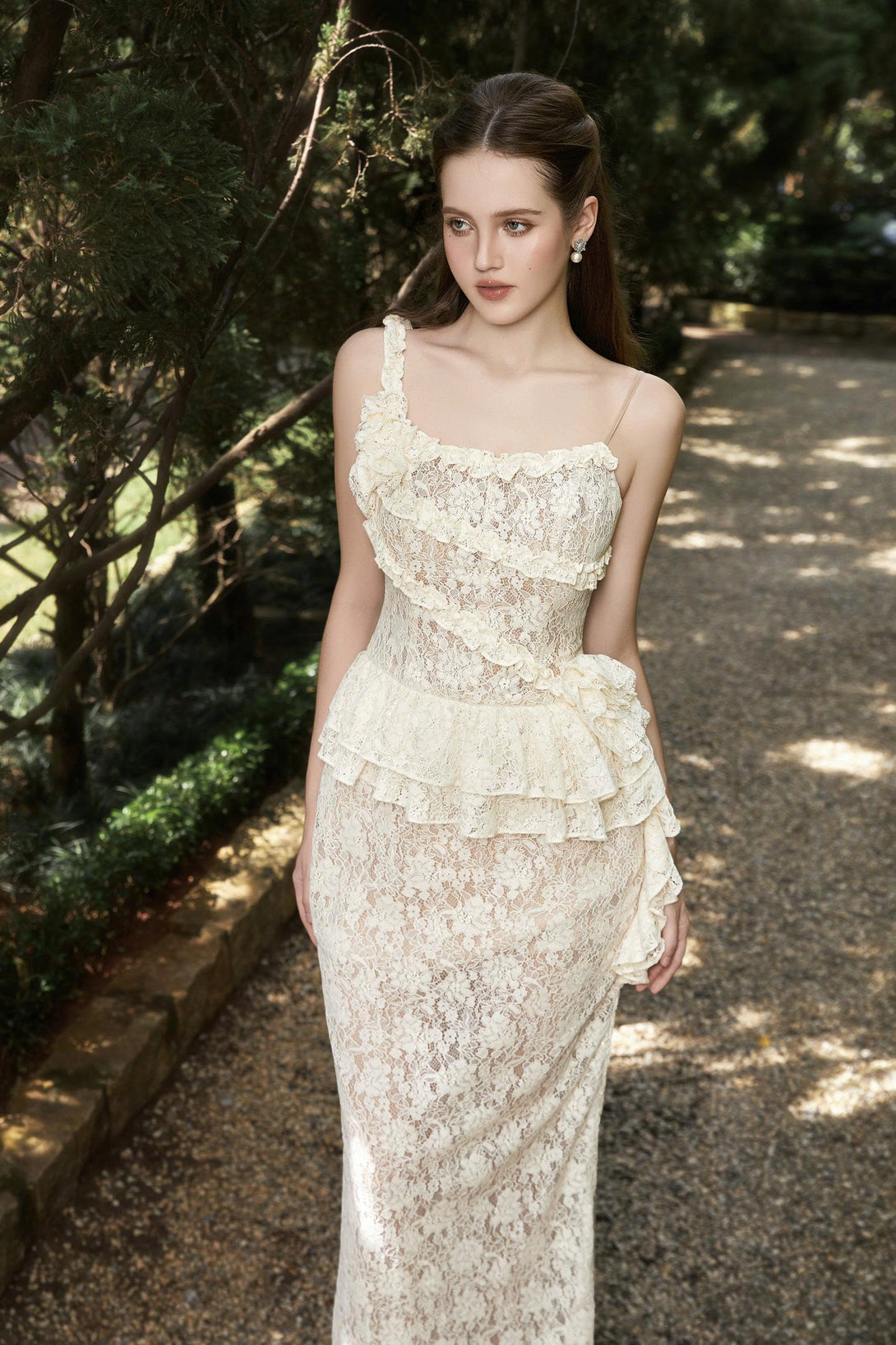 It is crafted entirely from delicate ivory lace, which gives it a soft, feminine, and ethereal appearance. The fitted bodice is designed with asymmetrical detailing: one shoulder strap adorned with a lace flower and cascading ruffles that flow diagonally across the chest, adding texture and visual interest. Around the waist, layered lace peplum ruffles accentuate the silhouette, creating a flattering hourglass shape. The skirt continues in the same intricate lace fabric, falling straight for a graceful, elongated look.