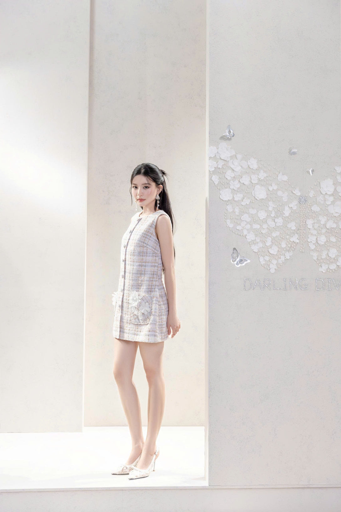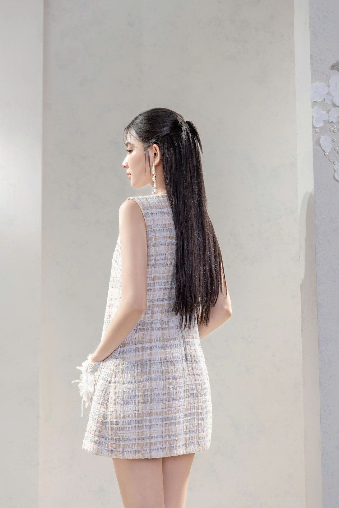 The white tweed mini dress, adorned with delicate 3D floral details on the front pockets, exudes a refined femininity. Crafted from premium tweed fabric, its soft texture and elegant silhouette highlight the wearer’s graceful figure.