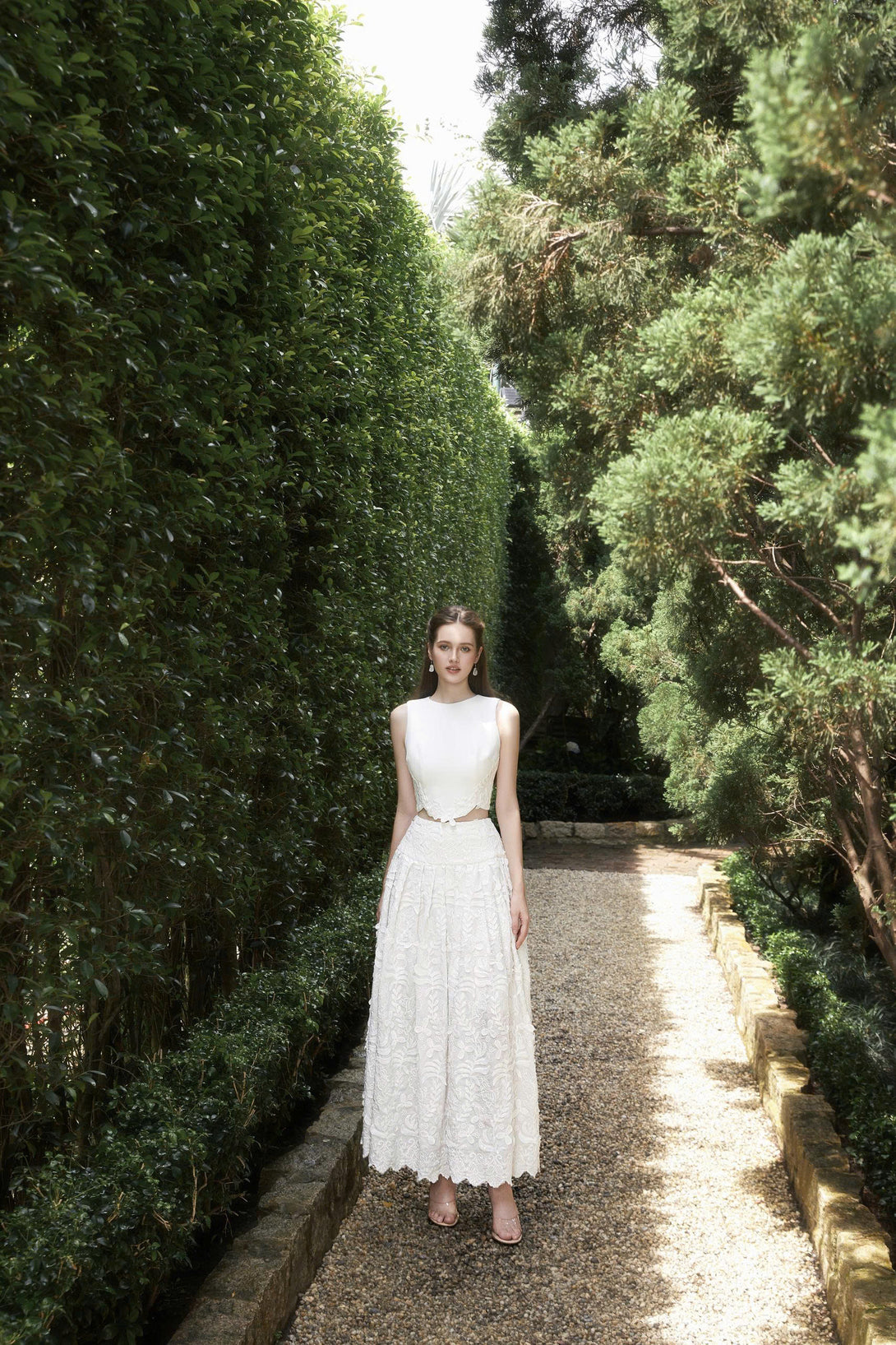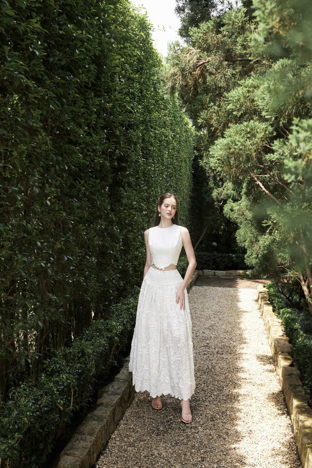 This two-piece white ensemble radiates understated sophistication with its clean, modern silhouette. The sleeveless crop top is crafted from smooth fabric and delicately adorned with tonal floral embroidery along the hem, creating a soft transition into the high-waisted skirt. The skirt itself flows gracefully, featuring intricate embroidered floral motifs that add subtle dimension and texture.